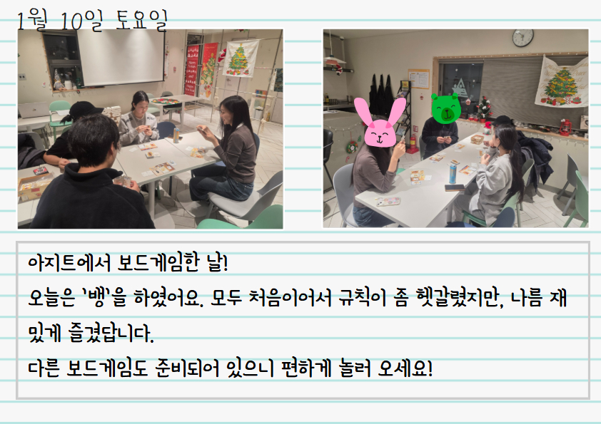 아지트 갤러리 전체 글제목 글내용 작성자 3월 21일 플로깅 기록! 매주 토요일은 플로깅 데이!(3월 14.. 2월 20일 호떡와플DAY! 아지트툰 제 1화! 오므라이스 편 아지트 식당 - 오므라이스편! 강북구청소년방송국 첫 영상이 게시되었습.. 아지트 사진 동아리 자하포토의 삼양동 .. 머핀 만든 날! 보드게임한 날! 1 2 3 4 5 6 7 8 9 10